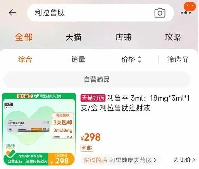 记者从某电商平台上看道,中美华东利拉鲁肽注射液一盒售价298元,适应症仍为二型糖尿病降糖治疗。