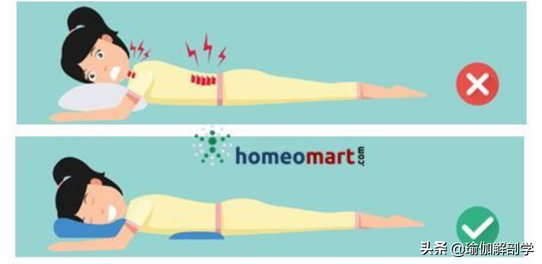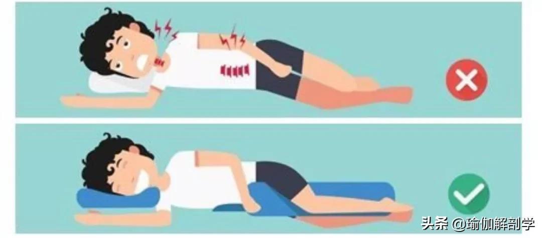 建议:侧睡时在腰椎下方垫枕头,膝盖中间夹枕头。